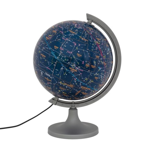 Globus z mapą nieba, z uwidocznionymi gwiazdozbiorami, zaznaczoną klasyfikacją widmową gwiazd, ich typami wielkością, znakami zodiaku i innymi niż gwiazdy obiektami astronomicznymi (skupiska gwiazd, galaktyki, mgławice itp.)