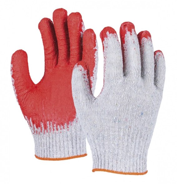 Rękawice wykonane z dzianiny bawełnianej w kolorze naturalnym, powleczone w części chwytnej lateksem w kolorze czerwonym