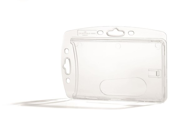 Twarde pudełko skutecznie chroni kartę i jednocześnie umożliwia szybki dostęp do niej dzięki wgłębieniu na kciuk. Identyfikator może być zawieszony w pionie lub poziomie. Może być zamocowany na zapięciu typu klip, na łańcuszku, taśmie tekstylnej lub mechanizmie ściągającym. Wymiary wewnętrzne : 54 x 85 mm (W x S)