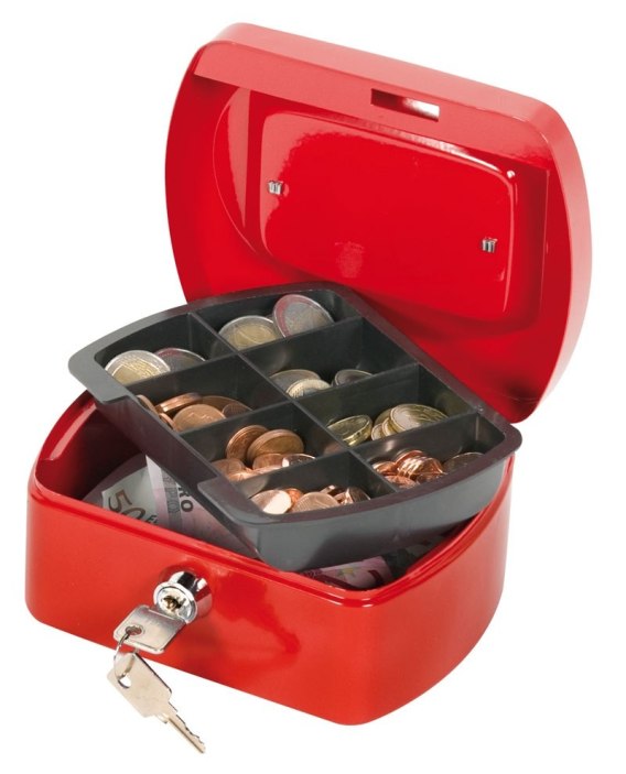 Mała kasetka na pieniądze wyprodukowana z lakierowanego proszkowo metalu odpornego na zarysowania