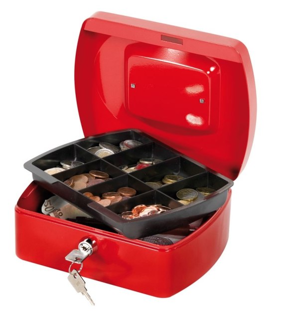 Średnia kasetka na pieniądze wyprodukowana z lakierowanego proszkowo metalu odpornego na zarysowania