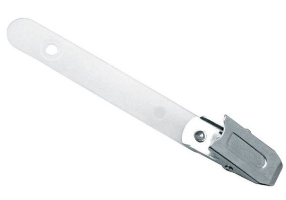 Metalowy klips z paskiem z mocnego, przezroczystego tworzywa zakończony plastikowym zatrzaskiem. Op.100szt.