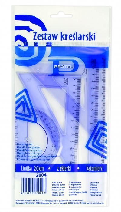 Zestaw kreślarski_z linijką w woreczku__zestaw kreślarski: 2 standardowe przezroczyste ekierki 45/60 stopni,_kątomierz 10 cm/180 stopni, linijka 16, 20 lub 30 cm__elementy zestawu posiadają trwałą nieścieralną podziałkę i zaokrąglone rogi_dla bezpieczeństwa użytkownika__precyzyjny nadruk skali (do 0,001 cm)__jednostka sprzedaży 1 zestaw