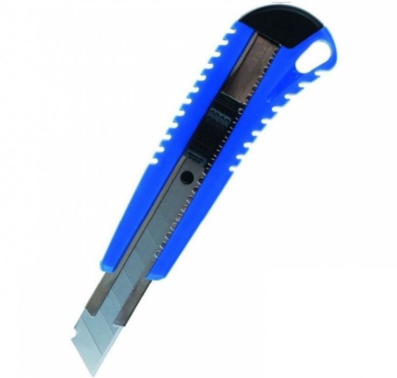 _ obudowa ABS _ metalowa prowadnica _ karbowane brzegi zapewniają lepszy chwyt _ otwór do zawieszania _ wysuwane, łamane ostrze _ samoczynna blokada ostrza _ wymiana ostrza przez zdjęcie czarnej końcówki _ do cięższych prac _ szerokość ostrza: 18 mm _ łamanie ostrza: 7 części