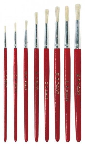 Wysokiej jakości pędzle szkolne ASTRY wykonane są z doskonałego drewna i naturalnego włosia, dzięki temu są trwałe i estetyczne. Paleta pędzli obejmuje 12 rozmiarów. W ofercie dostępne są pędzle okrągłe i płaskie.