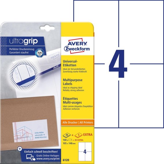 Trwałe etykiety uniwersalne 6120 105x148 30ark. białe, Avery Zweckform